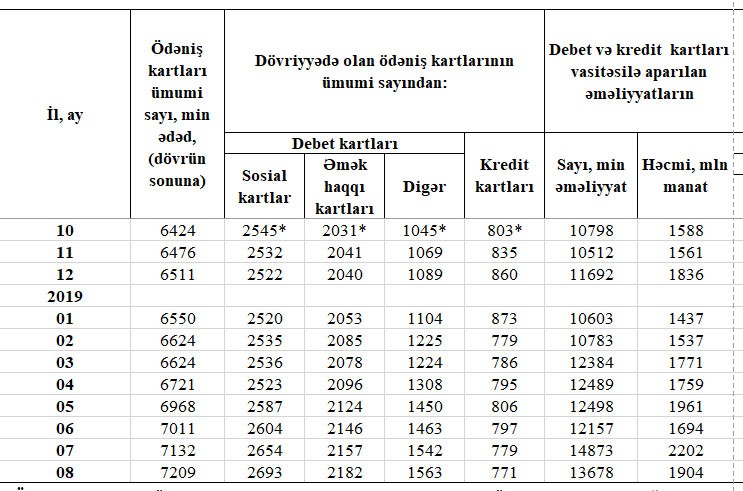 2018-ci ilin sonu ilə müqayisədə isə yanvar-avqust ayları ərzində (8 ayda) cəmi ödəniş kartlarının sayı 698 min ədəd, o cümlədən sosial kartların sayı 171 min ədəd, əmək haqqı kartlarının sayı 142 min ədəd, sosial kart və əməkhaqqı kartı olmayan digər debet kartlarının sayı isə 474 min ədəd artıb. Kredit kartlarının sayı isə 89 min ədəd azalıb.