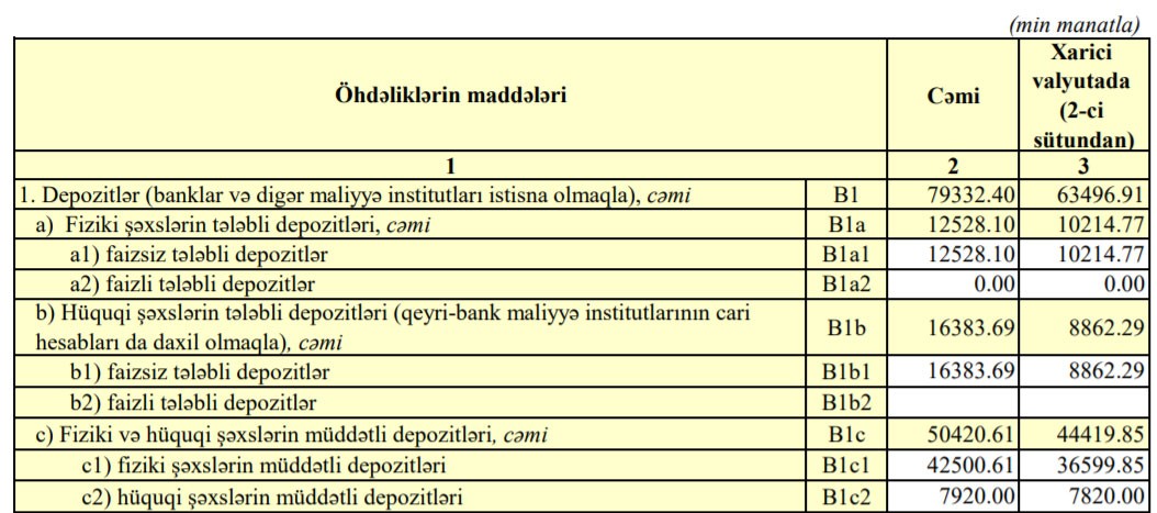 Cəmi depozitlərin 12 milyon 528 min manatını fiziki şəxslərin tələbli depozitləri, 16 milyon 383 min manatını hüquqi şəxslərin tələbli depozitləri, 50 milyon 420 min manatını fiziki və hüquqi şəxslərin müddətli depozitləri təşkil edib.