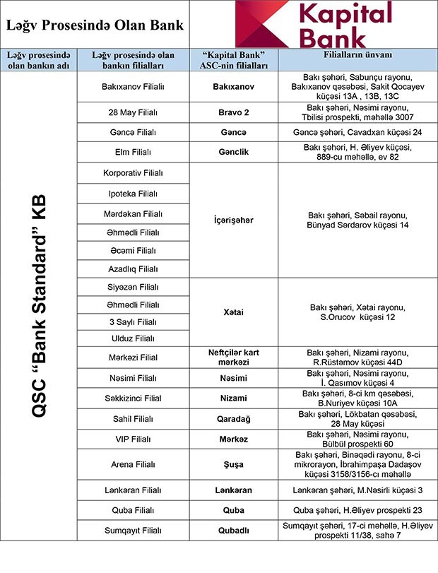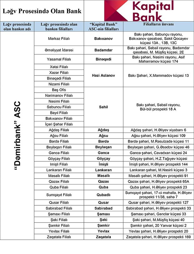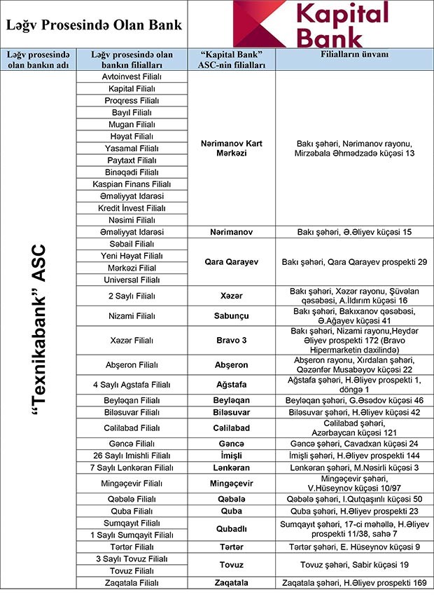 Ləğv prosesində olan banklarda kreditor tələbi olan fiziki şəxslərdən “Kapitalbank” ASC-nin aşağıda təqdim olunan siyahı üzrə filiallarına şəxsiyyətlərini təsdiq edən sənədlə müraciət olunması xahiş olunur.