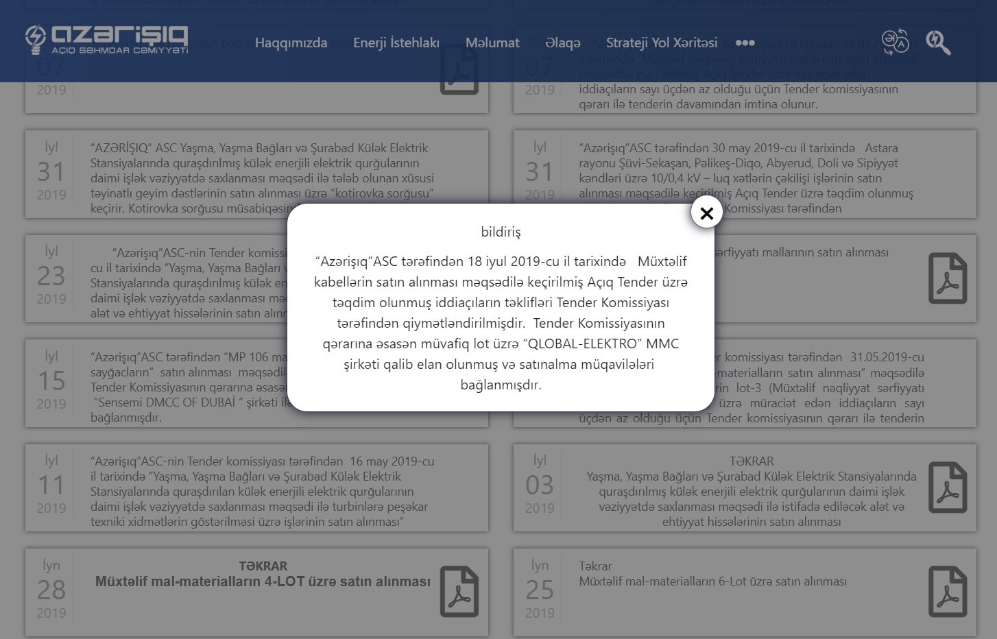 "Azərişıq" ASC "Mal-materialların satın alınması" üzrə elan etdiyi növbəti tenderinin qalibini elan edib: "Qlobal-Elektro" MMC.