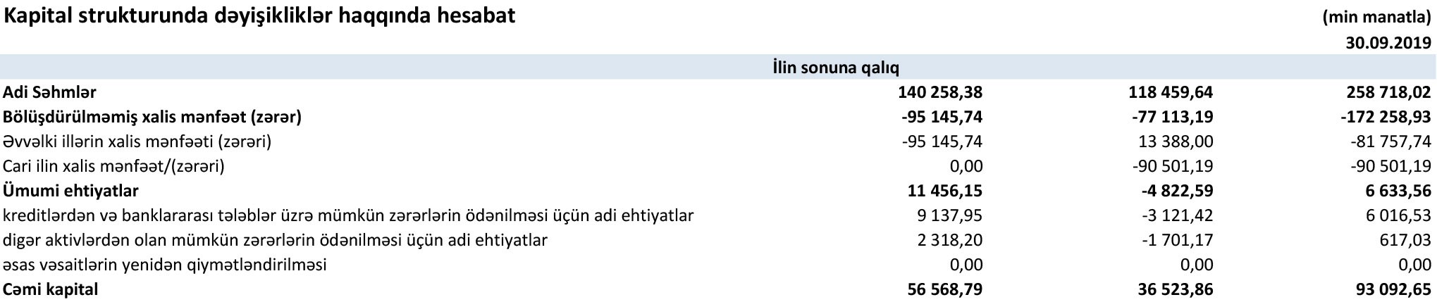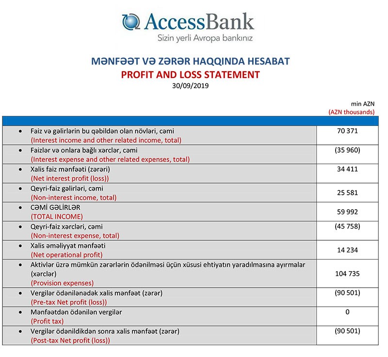 Bu ilin 90 milyon 501 min manat xalis zərər ilə “AccessBank”ın yığılmış zərəri 172 milyon 258 min manata çatıb. Bank 258 milyon 718 min manat nizamnamə kapitalına malik olduğundan bu zərər ödənib və bundan sonra “AccessBank”ın 93 milyon 93 min manat cəmi kapitalı da mövcuddur.
