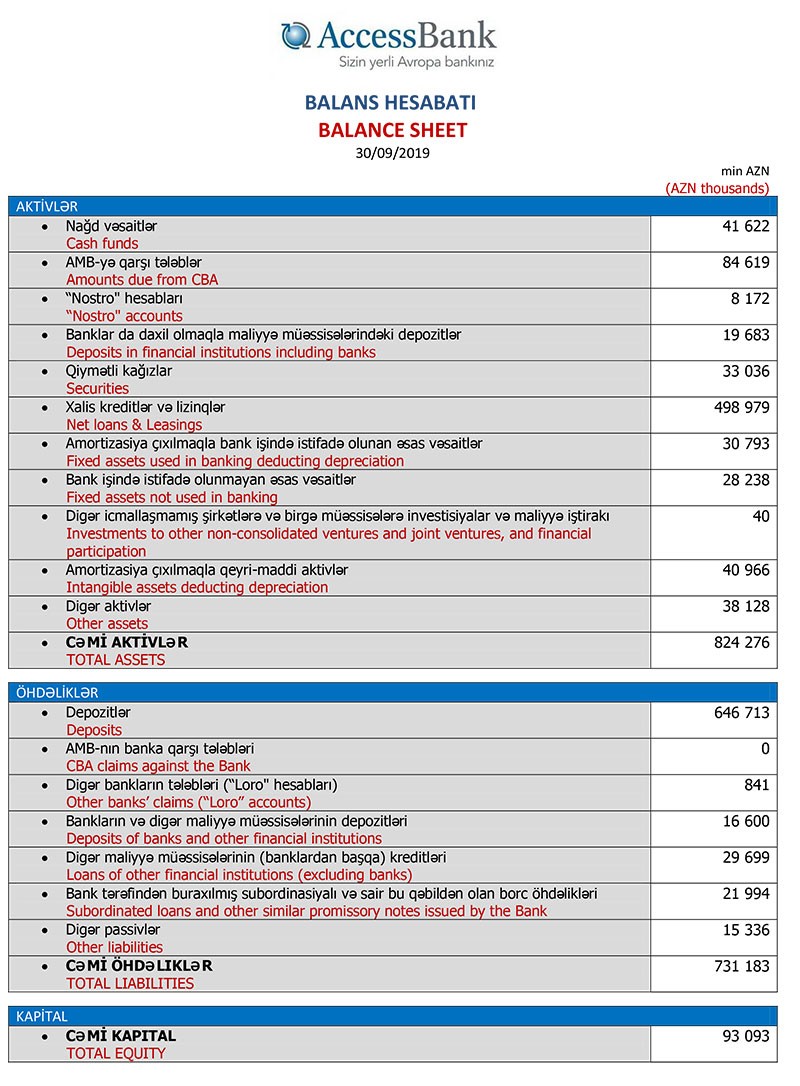 30 Sentyabr 2019-cu il tarixində “AccessBank”ın cəmi aktivləri 824 milyon 276 min manat, o cümlədən xalis kreditlər 498 milyon 979 min manat təşkil edib. 31 Dekabr 2018-ci il tarixində “AccessBank” 878 milyon 688 min manat cəmi aktivlərə, o xümlədən 542 milyon 488 min manat xalis kredit portfelinə malik idi.