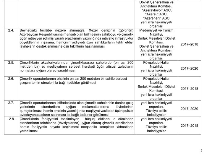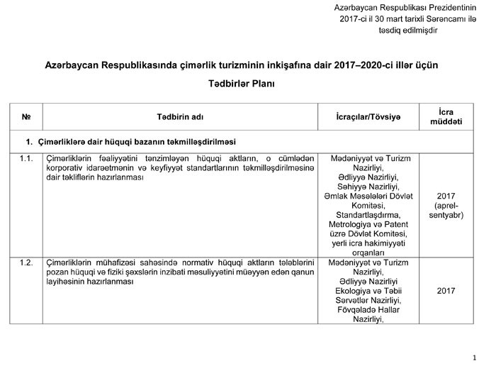 Sərəncam ilə, “Azərbaycan Respublikasında çimərlik turizminin inkişafına dair 2017–2020-ci illər üçün Tədbirlər Planı” təsdiq edilib.