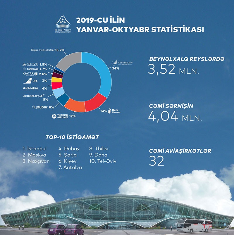 2019-cu ilin ilk 10 ayı ərzində Azərbaycanın beynəlxalq hava limanlarında sərnişin axını 4,7 milyon sərnişin təşkil etmişdir ki, bu da son illərin rekord göstəricisidir.