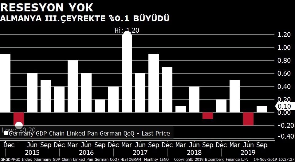 Almaniya iqtisadiyyatı 2019-cu ilin üçüncü rübündə sürpriz şəkildə 0.1% artım qeyd edərək durğunluğa girməyib. Proqnoz iqtisadiyyatın 0.1% azalacağı istiqamətində idi.