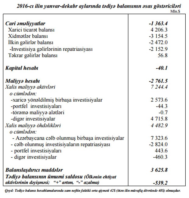 2016-cı ildə Azərbaycanın tədiyyə balansının kəsiri 539.2 milyon dollar təşkil edib.