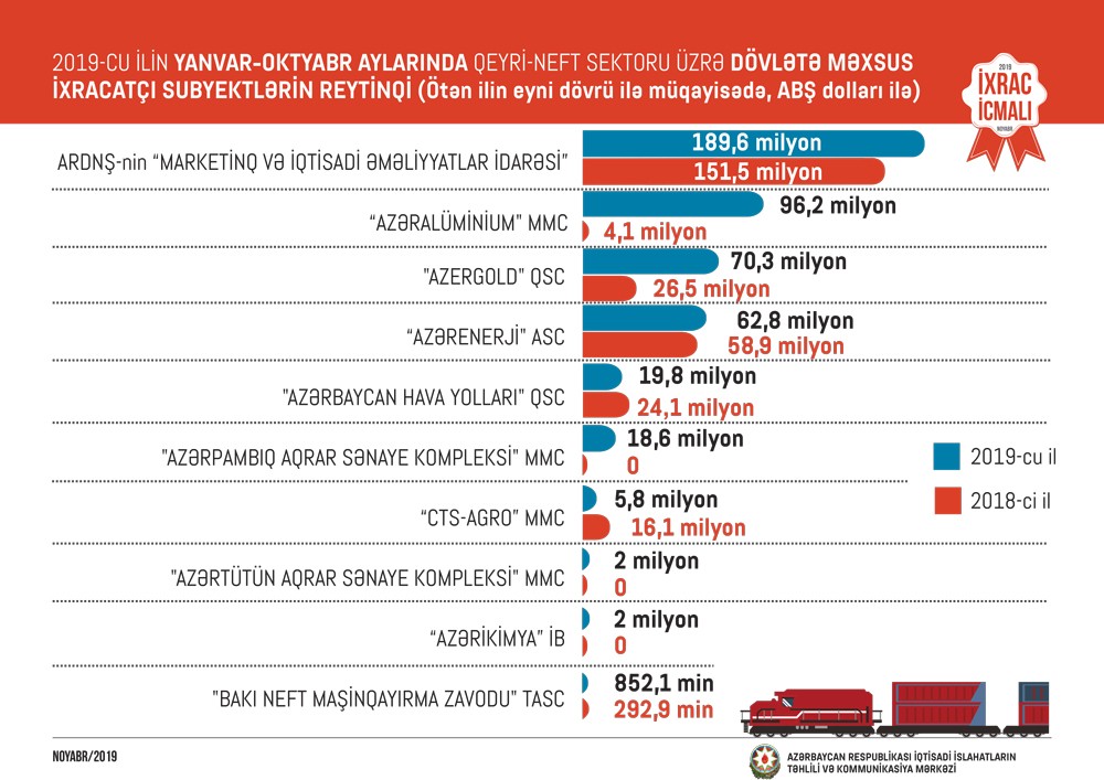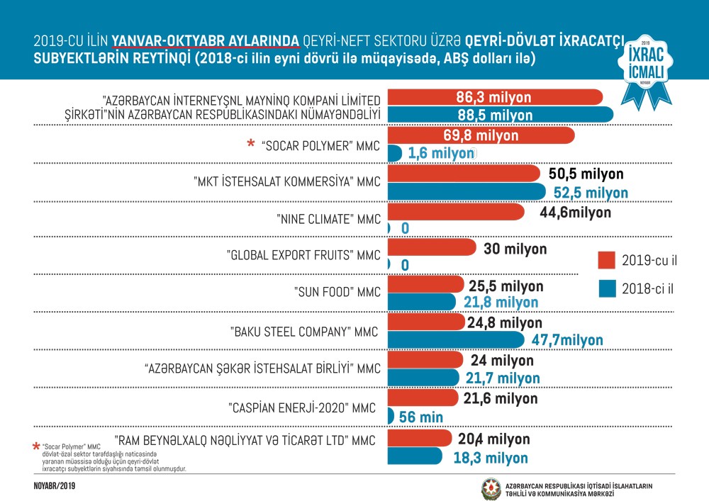 Bu ilin yanvar- oktyabr ayları üzrə hazırlanan qeyri-dövlət ixracatçı subyektlərin reytinqində ilk onluqda aşağıdakı şirkətlər təmsil olunurlar: "Azərbaycan İnterneyşnl Mayninq Kompani Limited Şirkəti"nin Azərbaycan Respublikasındakı nümayəndəliyi, “Socar Polymer” MMC, "MKT İstehsalat Kommersiya" MMC, "Nine Climate" MMC, "Global Export Fruits" MMC, “Sun Food" MMC, "Baku Steel Company", "Azərbaycan Şəkər İstehsalat Birliyi " MMC, "Caspian enerji-2020" MMC, "Ram Beynəlxalq Nəqliyyat və Ticarət Ltd" MMC.