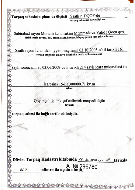 Saatlı rayon sakini Validə Məmmədova bildirib ki, Saatlı Rayon İcra Hakimiyyəti başçısı Gülhüseyn Əhmədovun 2000 və 2003-cü il tarixli sərəncamları ilə ailə kəndli təsərrüfatı ilə məşğul olmaq üçün ona 30 hektar torpaq sahəsi ayrılıb: