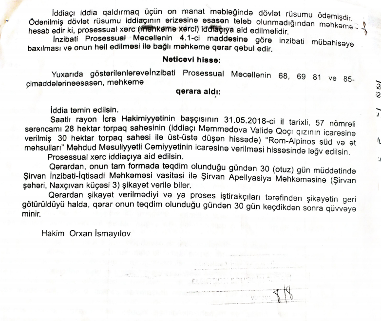 “O vaxtdan bəri mən burada qoyun və inək saxlayıram. 2009-cu ildə rayona yeni təyin olunan başçısı Siracəddin Cabbarov mənimlə həmin torpaq sahəsinin 15 il müddətinə istifadə edilməsi ilə bağlı icarə müqaviləsi bağladı. Lakin Siracəddin Cabbarov 2018-ci ildə torpağı qanunsuz olaraq İbrahim Nehrəmliyə verib. O da bir müddət sonra mənə verilən torpağın qonşuluğunda “Rom-Alpinos süd və ət məhsulları” MMC üçün fermalar tikdi. İbrahim Nehrəmli hər həftə sonu bura gəlib bizə ərazidən çıxmağımızı tələb edir. Biz bundan sonra məhkəməyə müraciət etdik və Şirvan İnzibati-iqtisadi Məhkəməsi bizim xeyrimizə qərar çıxardı.