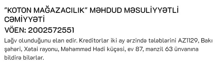 2013-cü ildən fəaliyyət göstərən "Koton Mağazaçılıq" MMC fəaliyyətini dayandırıb.