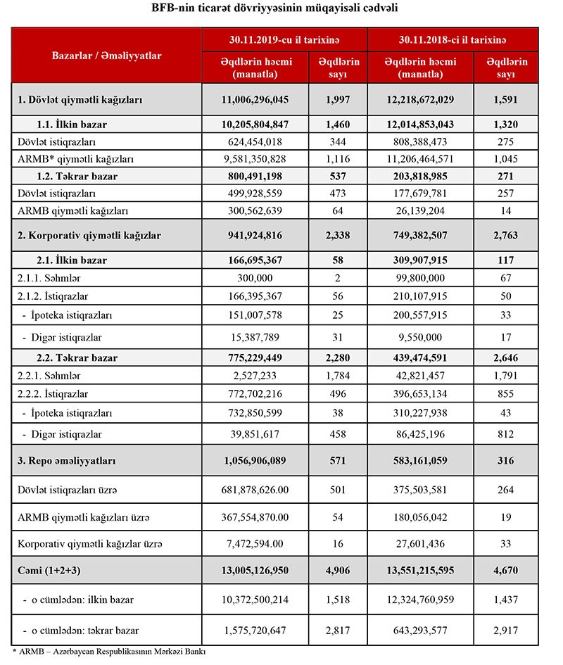“Nəticə olaraq, 2019-cu ilin on bir ayında dövlət qiymətli kağızların ilkin bazarında yerləşdirmələrin həcmində ötən ilə nəzərən azalma müşahidə olumasına baxmayaraq, dövlət qiymətli kağızların təkrar bazarında ticarət həcmi 293%, korporativ qiymətli kağızların təkrar bazarında 76% və repo əməliyyatlarında isə 81% artım qeydə alınmışdır”, - Birjanın məlumatında deyilir.