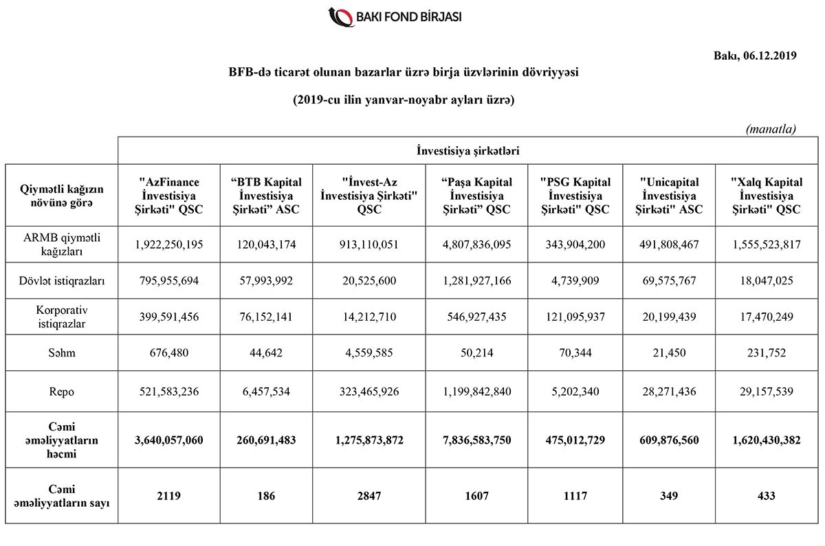 2019-cu ilin yanvar-noyabr ayları ərzində Bakı Fond Birjasında (BFB) ticarət olunan bazarlar üzrə birja üzvlərinin dövriyyələri açıqlanıb.