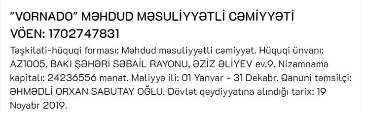 19 Noyabr 2019-cu il tarixində Vergilər Nazirliyi "Vornado" MMC adlı şirkəti dövlət qeydiyyatına alıb.