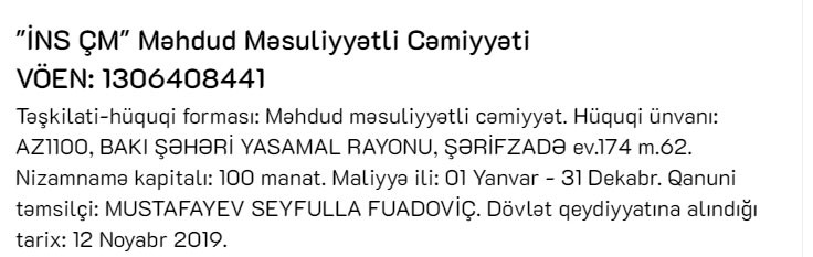 "Marja" xəbər verir ki, nizamnamə kaptalı 100 manat təşkil edən “İNS ÇM” MMC Şərifzadə küç., 174, məhəllə 62 ünvanında qeydiyyatdan keçib. Şirkətin qanuni nümayndəsi Mustafayev Seyfulla Fuad oğludur.