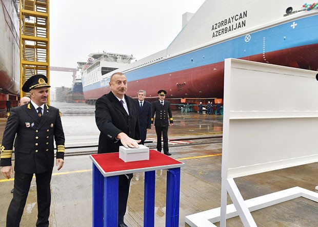 Prezident İlham Əliyev “Azərbaycan” gəmi-bərəsinin suya salınmasını bildirən düyəni basıb.