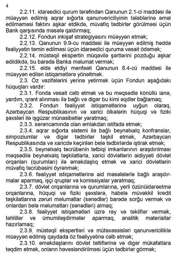 Fond qəbul etdiyi sığorta öhdəliklərinin idarəedilməsini təmin etmək məqəsədi ilə sığorta və təkrarsığorta siyasətini müəyyən etmək, effektiv fəaliyyətini təmin etmək üçün aktivlərin investisiyaya yönəldilməsi barədə investisiya siyasətini qəbul etmək, sığorta vasitəçiliyi fəaliyyəti üçün vasitəçi aqrar sığortaçılarla müqavilə bağlamaq, habelə aqrar sığorta sisteminin dayanıqlı olması istiqamətində siyasət və qaydaların qəbul edilməsi kimi səlahiyyətlərə malikdir.