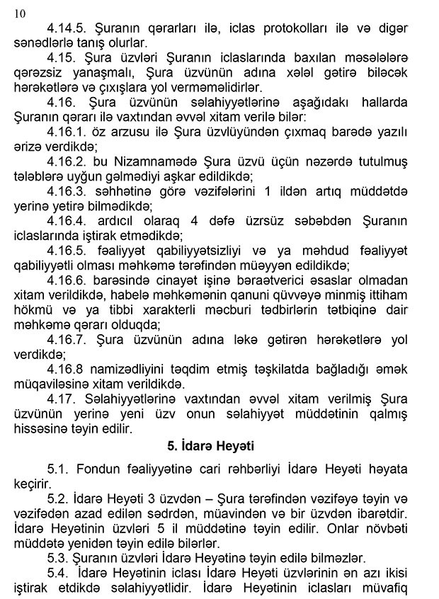 Fondun Himayəçilik Şurasının sədri Azərbaycan Respublikası Kənd Təsərrüfatı Nazirliyinin nümayəndəsidir.