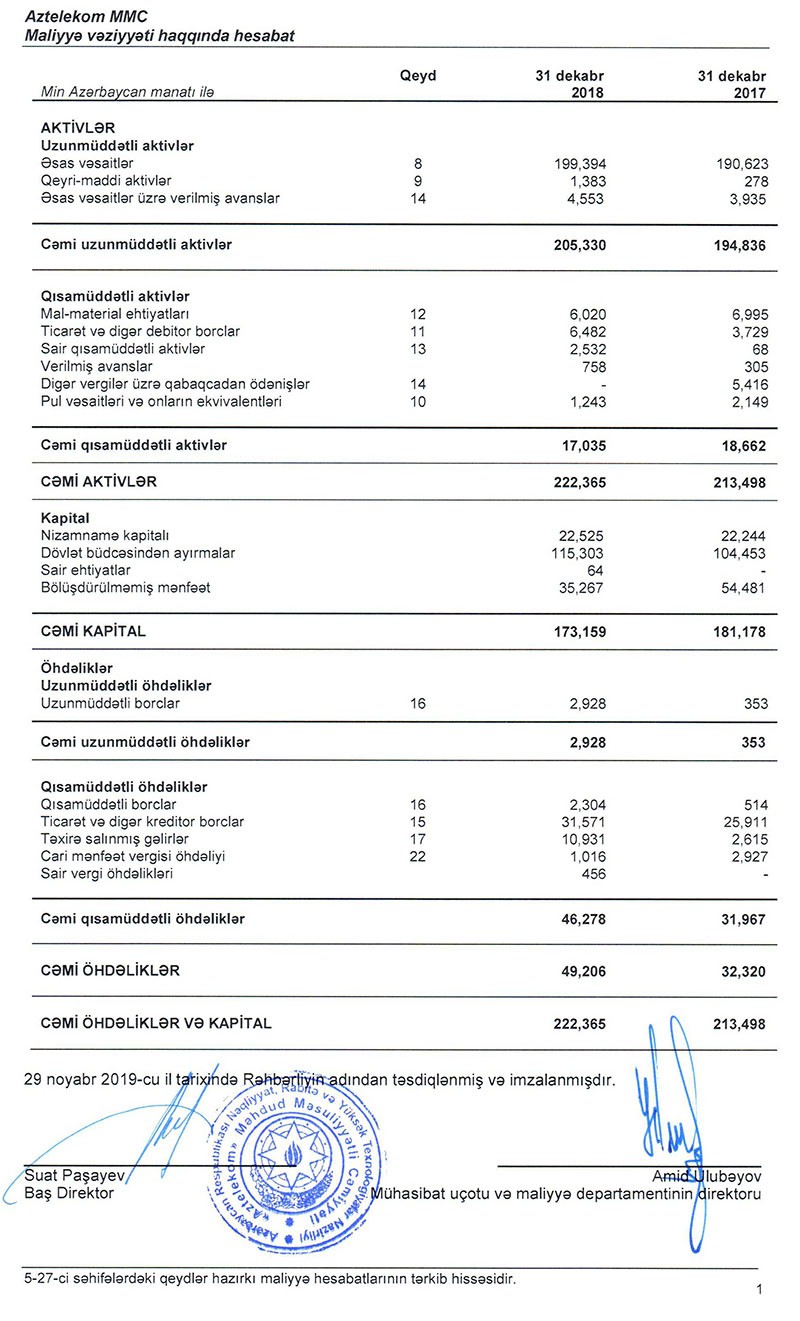 “Aztelekom” MMC-nin 31 dekabr 2018-ci il tarixinə maliyyə hesabatları "PwC Audit Azerbaijan" şirkəti tərəfindən yoxlanılıb.
