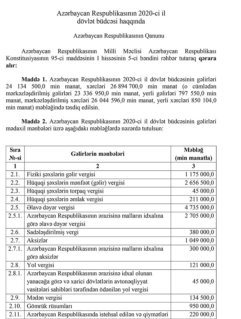 "Marja" xəbər verir ki, Qanun ilə, Azərbaycan Respublikasının 2020-ci il dövlət büdcəsinin gəlirləri 24 milyard 134 milyon 500 min manat, xərcləri 26 milyard 894 milyon 700 min manat məbləğində təsdiq edilib.