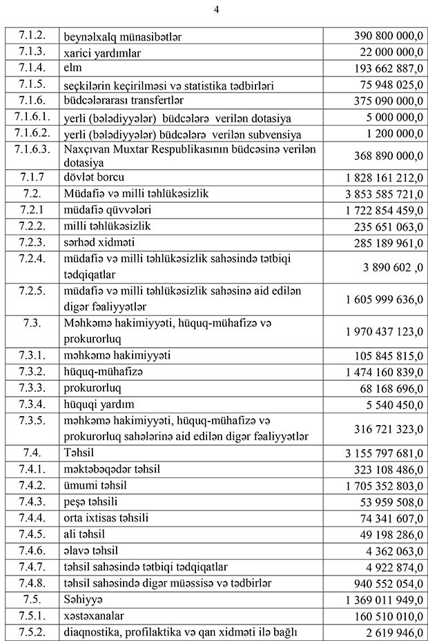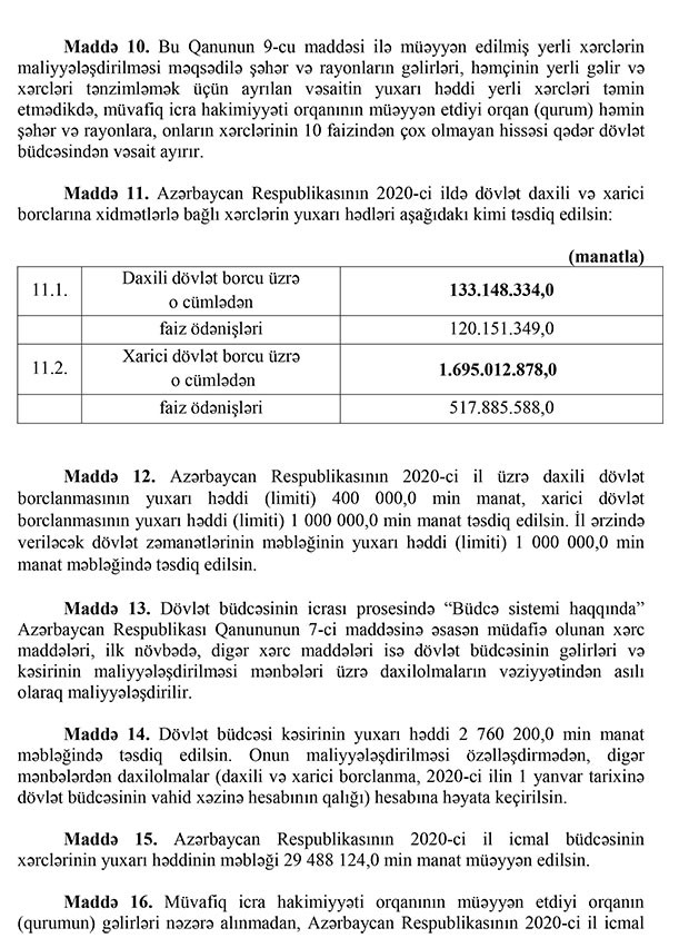Həmçinin, Azərbaycan Respublikasının 2020-ci il üzrə daxili dövlət borclanmasının yuxarı həddi (limiti) 400 milyon manat, xarici dövlət borclanmasının yuxarı həddi (limiti) 1 milyard manat təsdiq edilib. İl ərzində veriləcək dövlət zəmanətlərinin məbləğinin yuxarı həddi (limiti) də 1 milyard manat məbləğində təsdiq edilib.
