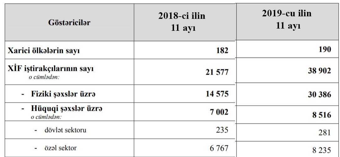 Müqayisə üçün qeyd edək ki, ötən ilin 11 ayında xarici ticarət iştirakçılarının sayı 21 577, o cümlədən fiziki şəxslər üzrə 14 575, hüquqi şəxslər üzrə 7 002 idi. Beləliklə, xarici ticarət iştirakçılarının sayı 17 325 şəxs, o cümlədən fiziki şəxslər üzrə 15811 şəxs, hüquqi şəxslər üzrə 1514 şəxs artıb.