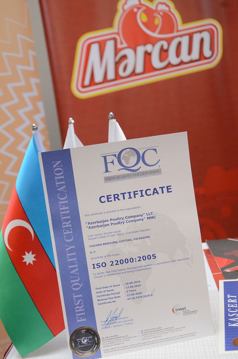 Mərasimdə qeyd olunub ki, 2018-ci idən etibarən “Mərcan” məhsullarının istehsalına qida təhlükəsizliyi və halal standartlar üzrə aparıcı mütəxəssisləri tərəfindən ciddi nəzarət və məsləhət layihəsi başlanıb. Həmin layihə çərçivəsində şirkətin struktur bölmələrində, o cümlədən Ucar rayonunda yerləşən quş ətinin emalı fabrikində diaqnostik audit və mövcud idarəetmə sisteminin təhlili aparılıb, müəssisənin əməkdaşlarına qeyd olunan standartlar üzrə müvafiq təlimlər keçirilib. Həmin auditlərin nəticəsi olaraq APC-nın ISO 22000 və Halal standartların tələblərinə uyğunluğu barədə müsbət rəy verilib və şirkətin fəaliyyəti ISO 22000 standartı üzrə Almaniyanın “DAKKS” akkreditasiyalı sertifikatı və dünyanın halal standartlar üzrə ən nüfuzlu sertifikatlaşdırma orqanlarından biri olan - Malayziyanın "JAKIM" təşkilatının təsdiq etdiyi HALAL sertifikatı ilə təsdiqlənib.