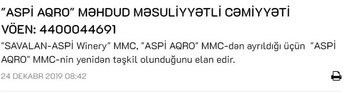 ""SAVALAN-ASPİ Winery" MMC, "ASPİ AQRO" MMC-dən ayrıldığı üçün "ASPİ AQRO" MMC-nin yenidən təşkil olunduğunu elan edir",- şirkətin elanında bildirilir.
