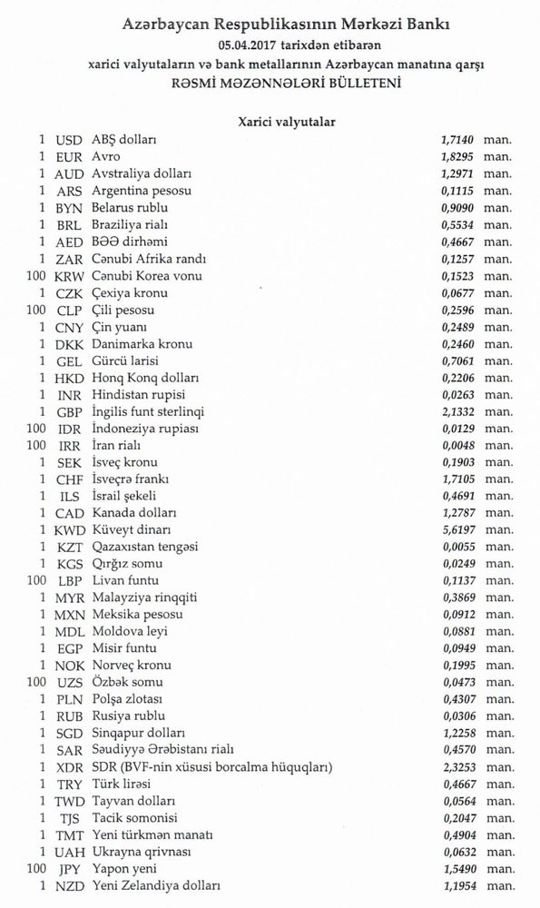 Aprelin 4-də 1 dollar 1,7244 manata, 1 avro isə 1.8401 manata bərabər idi.