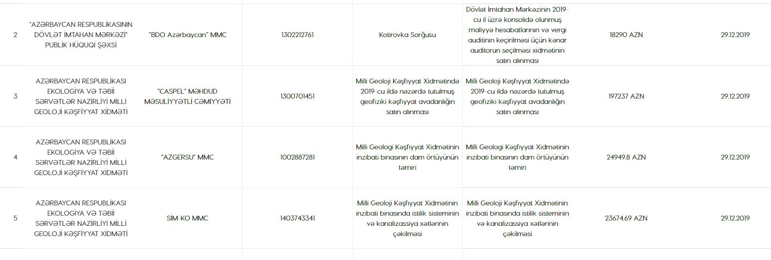 Həmçinin Milli Geoloji Kəşfiyyat Xidməti “SİM-KO ” MMC ilə də müqavilə bağlayıb. Məbləği 2 milyon 367 min manat olan müqavilə “Milli Geoloji Kəşfiyyat Xidmətinin inzibati binasında istilik sisteminin və kanalizasiya xətlərinin çəkilməsi”ni nəzərdə tutur.