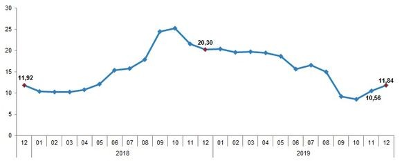 Türkiyədə istehlakçı qiymətləri indeksi ötən ilin Dekabr ayında 2018-ci ilin Dekabr ayı ilə müqayisədə 11.84% (illik inflyasiya), ötən ilin Noyabr ayı ilə müqayisədə isə 0.74% artıb (aylıq inflyasiya).