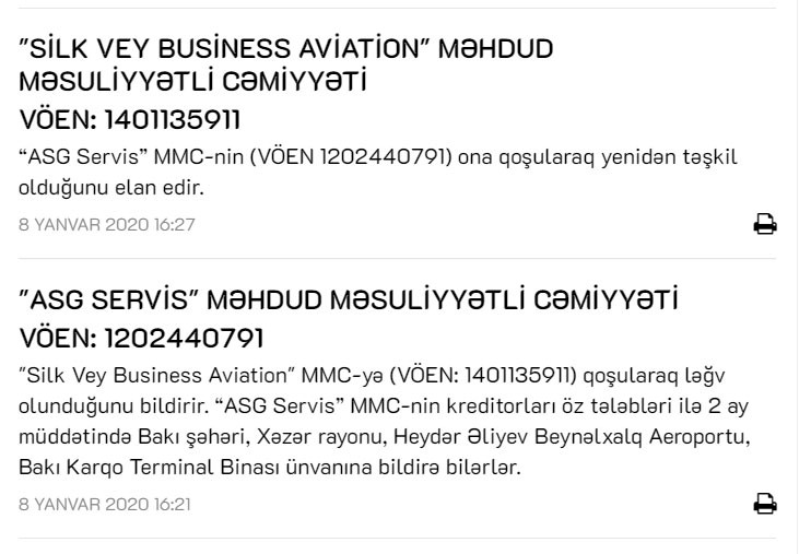 "“ASG Servis” MMC "Silk Vey Business Aviation" MMC-yə qoşularaq ləğv olunduğunu bildirir. “ASG Servis” MMC-nin kreditorları öz tələbləri ilə 2 ay müddətində Bakı şəhəri, Xəzər rayonu, Heydər Əliyev Beynəlxalq Aeroportu, Bakı Karqo Terminal Binası ünvanına bildirə bilərlər",- Şirkətin elanında deyilir.