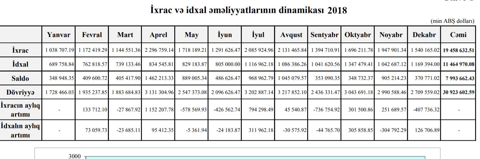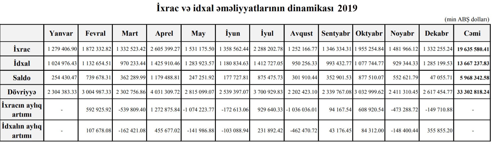 Müqayisə üçün qeyd edək ki, 2018-ci ilin yanvar-dekabr dövründə idxal 11 milyard 464 milyon 970 min dollar, ixrac isə 19 milyard 458 milyon 632 min dollar təşkil etmişdi.