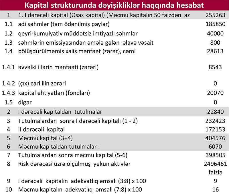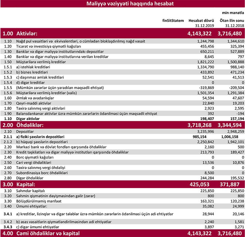2018-ci ilin sonu ilə müqayisədə “Kapital Bank”ın cəmi aktivləri 11,4% artaraq 2019-cu ilin sonunda 4 milyard 143 milyon 322 min manata, müştərilərə verilən kreditlər 21,3% artaraq 1 milyard 821 milyon 222 min manata, depozitlər isə 9,7% artaraq 3 milyard 235 milyon 996 min manata çatıb.