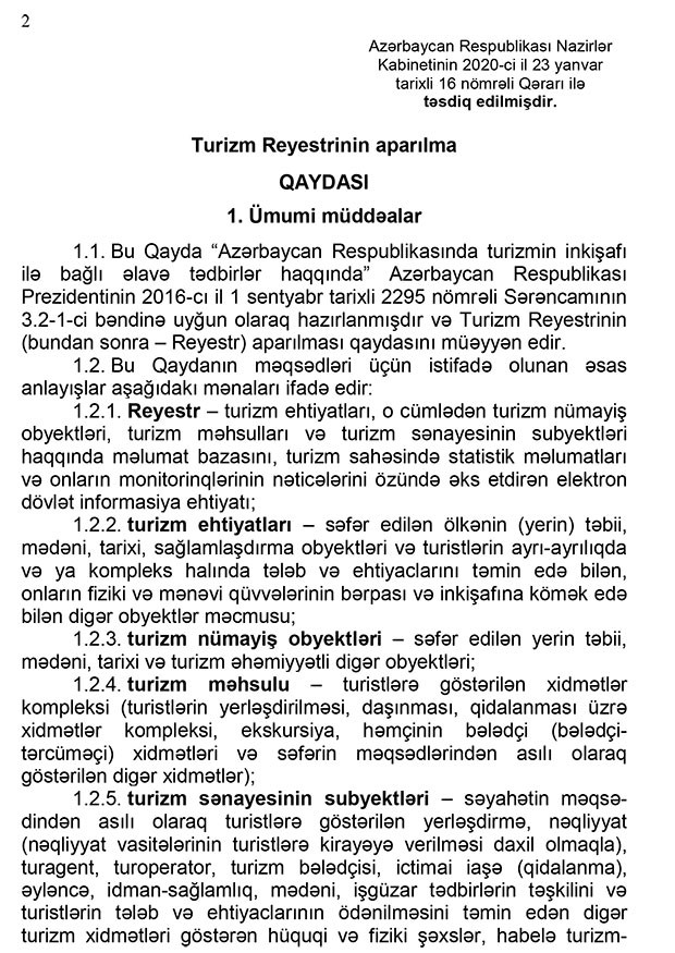 Azərbaycan Respublikasının Nazirlər Kabineti “Turizm Reyestrinin aparılma Qaydası”nı təsdiq edib.