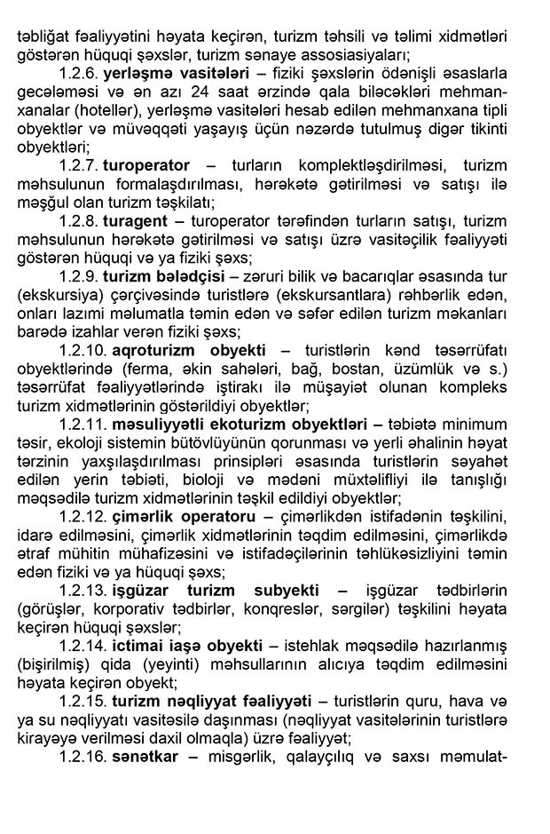 3. turizm sənayesinin subyektləri: yerləşmə vasitələri; turoperator və turagentlər; turizm bələdçiləri; aqroturizm obyektləri; məsuliyyətli ekoturizm obyektləri; çimərlik operatorları; özündə bir neçə fəaliyyət sahəsini birləşdirən qarışıq tipli turizm obyektləri; işgüzar turizm subyektləri; ictimai iaşə obyektləri; turizm nəqliyyat fəaliyyəti ilə məşğul olan şəxslər; əyləncə obyektləri; turizm təhsili və təlimi xidmətləri göstərən hüquqi şəxslər; “Azərbaycan Turizm Bürosu” publik hüquqi şəxs, onun filial və nümayəndəlikləri; turizm sənaye assosiasiyaları; sənətkarlar;