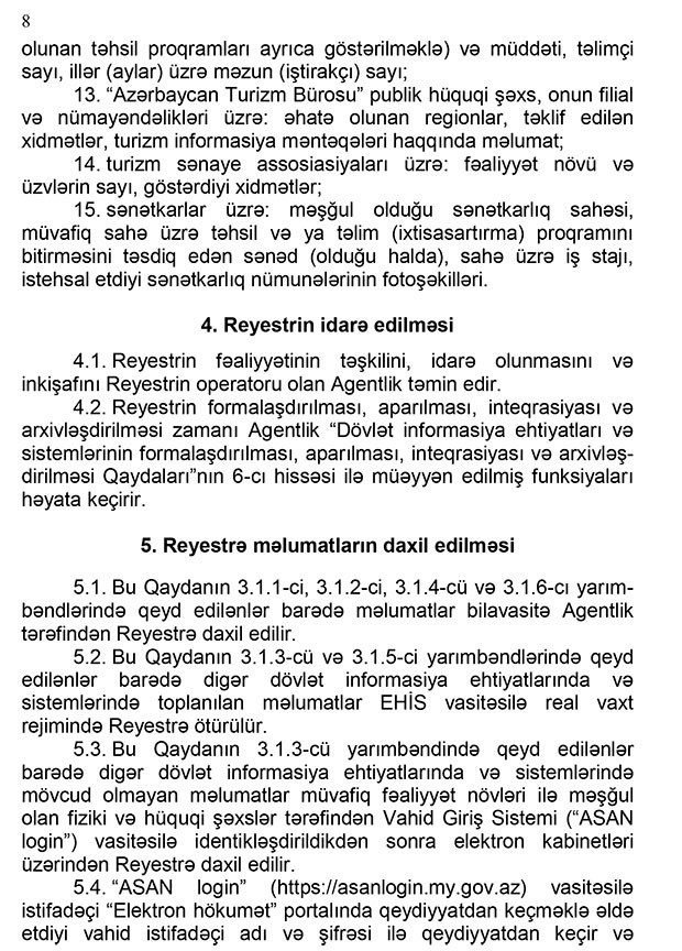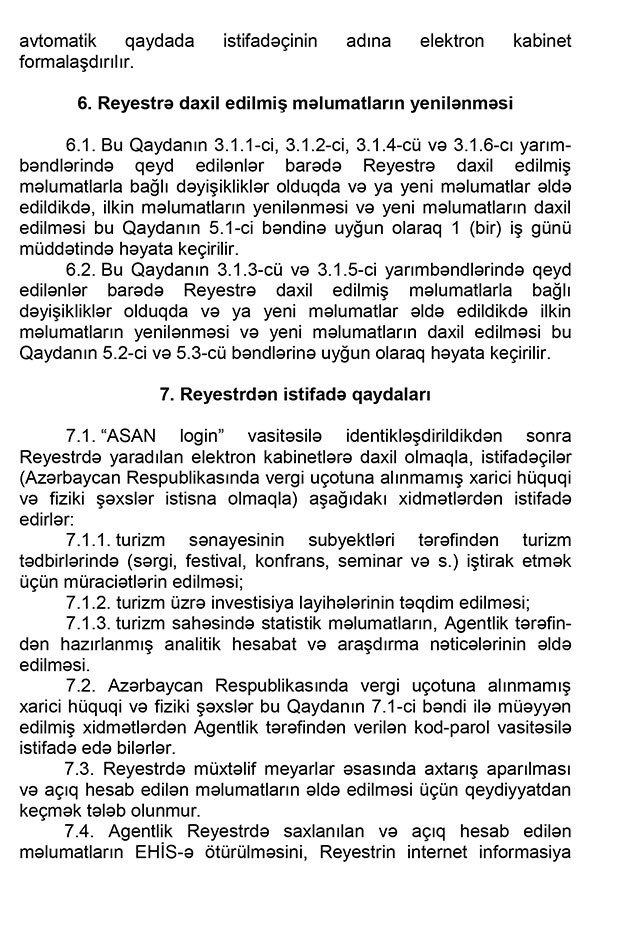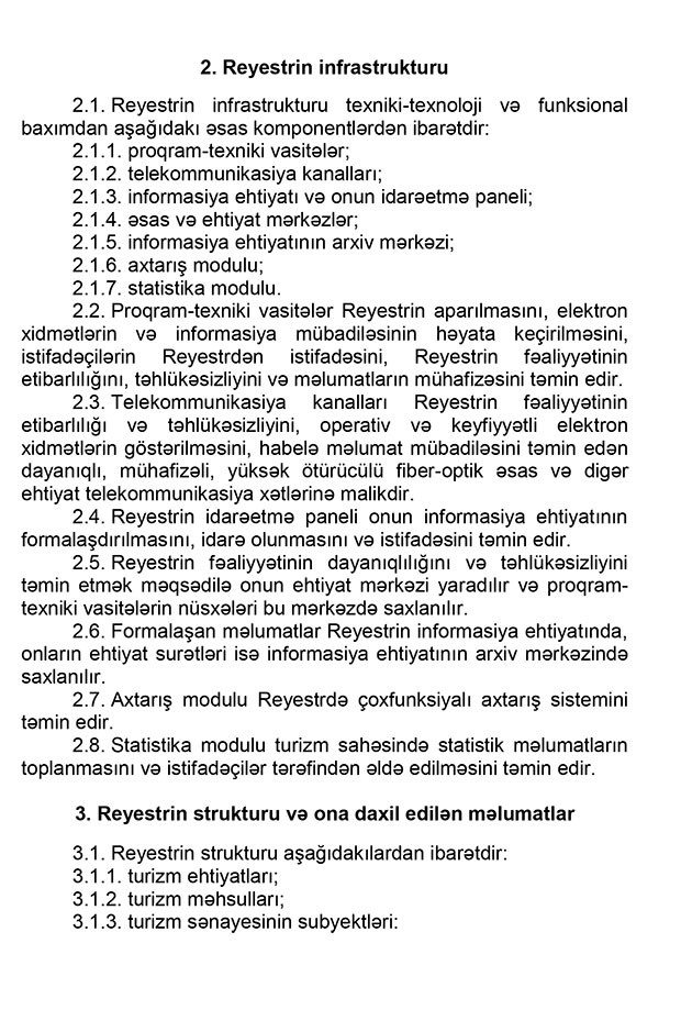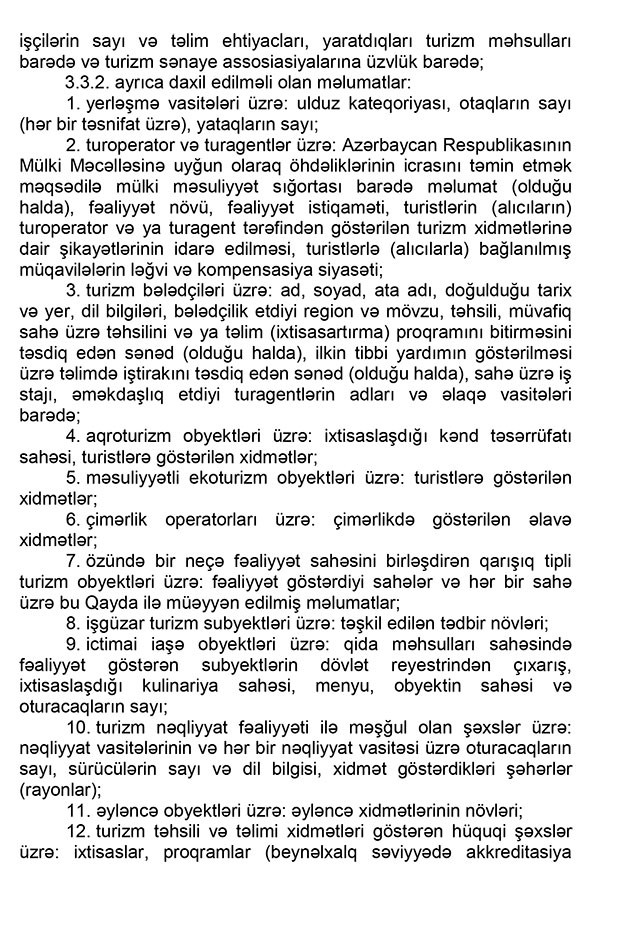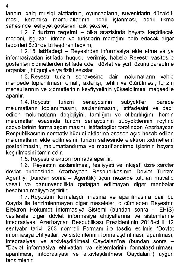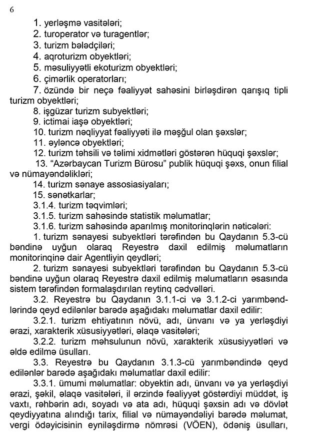 “Marja”nın məlumatına görə, Baş Nazir Əli Əsədovun imzaladığı qaydalarda bildirilir ki, reyestr – turizm ehtiyatları, o cümlədən turizm nümayiş obyektləri, turizm məhsulları və turizm sənayesinin subyektləri haqqında məlumat bazasını, turizm sahəsində statistik məlumatları və onların monitorinqlərinin nəticələrini özündə əks etdirən elektron dövlət informasiya ehtiyatıdır.