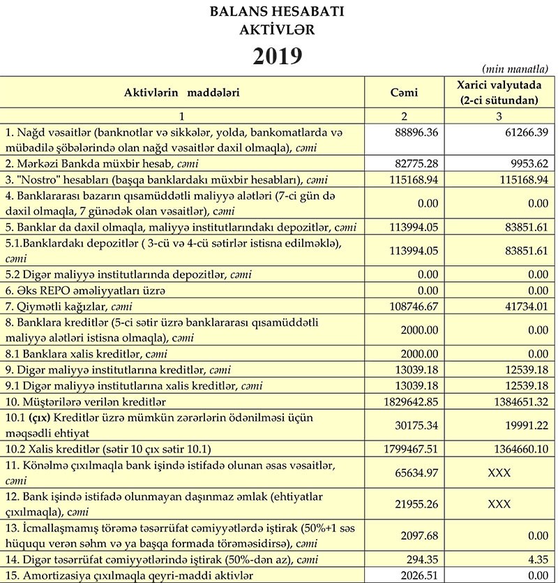 31 Dekabr 2019-cu il tarixində Xalq Bankın cəmi aktivləri 2 milyard 458 milyon 468 min manat, o cümlədən müştərilərə verilən kreditlər 1 milyard 829 milyon 642 min manat təşkil edib.