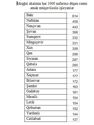 Qrafikdə rəsmi əmək müqavilələrilə məşğulluq əmsalının ən yüksək və ən aşağı olduğu 10 rayon (şəhər) göstərilib. Bu qrafikə həm də pensiyaya çıxmaq üçün ən şanslı və daha az şanslı coğrafiyanın xəritəsi də demək olar”.