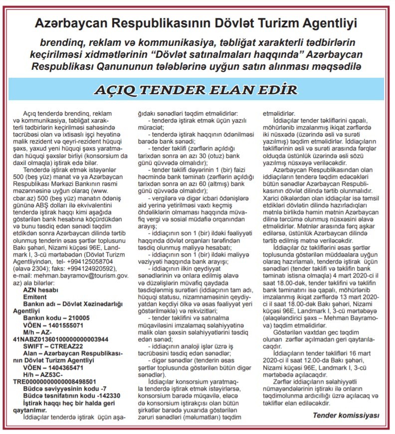 Azərbaycan Respublikasının Dövlət Turizm Agentliyi brendinq, reklam və kommunikasiya, təbliğat xarakterli tədbirlərin keçirilməsi xidmətlərinin “Dövlət satınalmaları haqqında” Azərbaycan Respublikası Qanununun tələblərinə uyğun satın alınması məqsədilə Açıq tender elan edib.