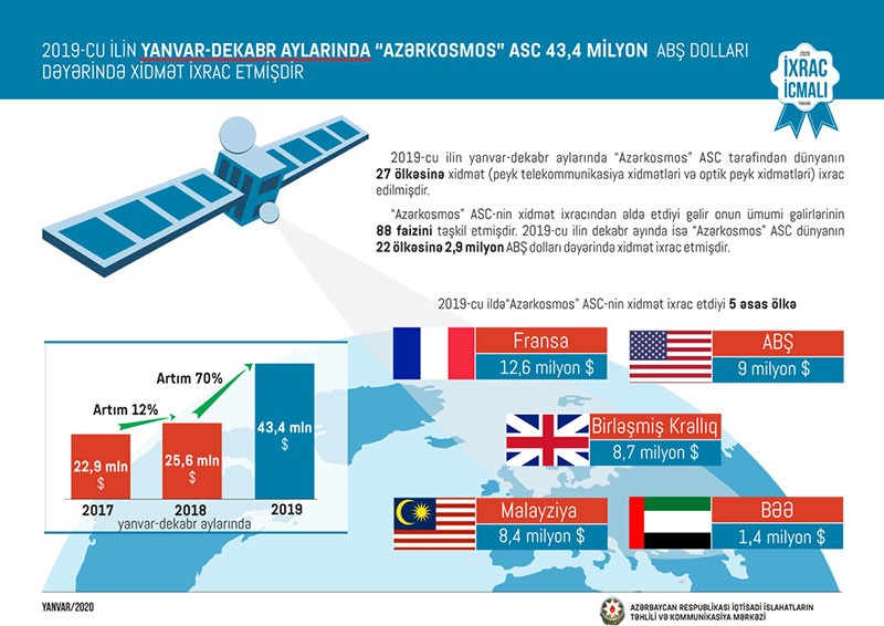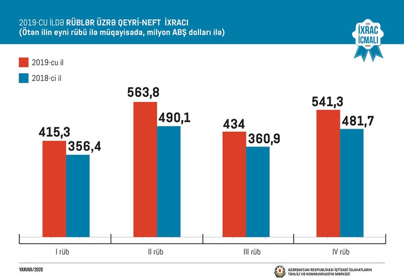 İcmalın bu sayında göstərilir ki, 2019-cu ilin yanvar-dekabr ayları ərzində qeyri-neft sektoru üzrə ixrac 1 milyard 954 milyon ABŞ dolları təşkil edib. 2018-ci illə müqayisədə 2019-cu ildə qeyri-neft sektoru üzrə ixrac 265 milyon ABŞ dolları və ya 15,7 faiz artıb.