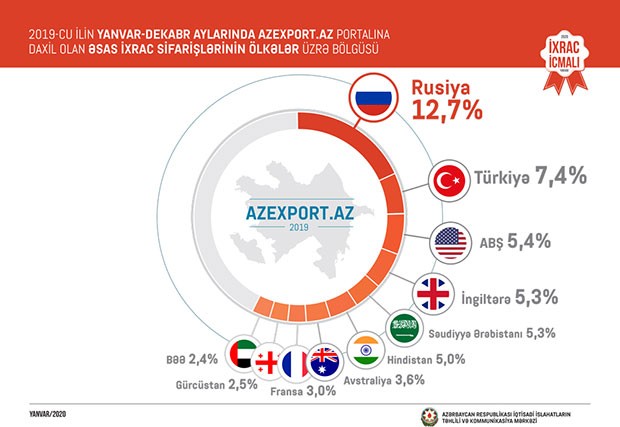 Ötən il ərzində Rusiyaya 690,6 milyon, Türkiyəyə 401,8 milyon, İsveçrəyə 179 milyon, Gürcüstana 159,1 milyon və Ukraynaya 50,6 milyon ABŞ dolları dəyərində qeyri-neft sektoruna aid mal ixrac olunub. 2018-ci ilin müvafiq dövrü ilə müqayisədə 2019-cu ildə Rusiyaya qeyri-neft ixracı 11,5 faiz, Türkiyəyə 16,5 faiz, İsveçrəyə 32,2 faiz, Gürcüstana 27,8 faiz və Ukraynaya 24,6 faiz artıb.