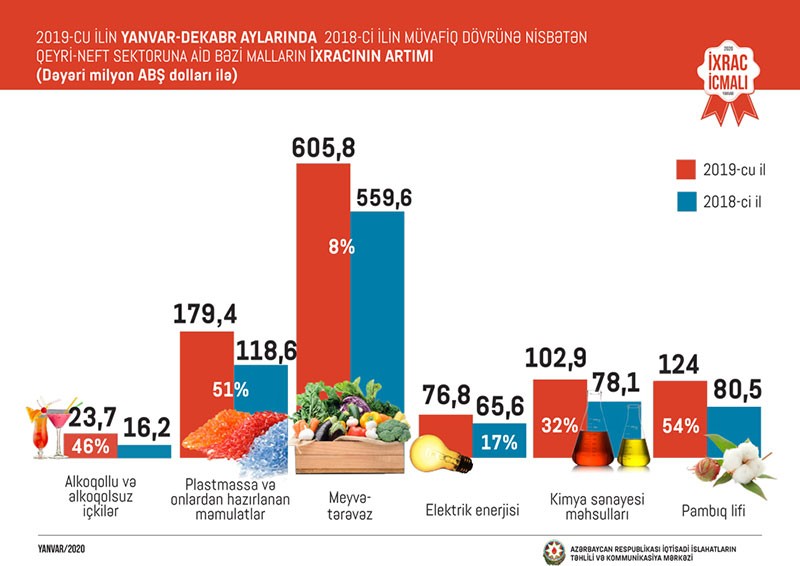 2018-ci illə müqayisədə 2019-cu ildə pambıq lifinin ixracı 54 faiz, plastmassa və onlardan hazırlanan məmulatların ixracı 51 faiz, alkoqollu və alkoqolsuz içkilərin ixracı 46 faiz, kimya sənayesi məhsullarının ixracı 32 faiz, pambıq ipliyinin ixracı 27 faiz, elektrik enerjisi ixracı 17 faiz, alüminium və ondan hazırlanan məmulatların ixracı 14 faiz, şəkər ixracı 8 faiz, meyvə-tərəvəzin ixracı 8 faiz artıb.