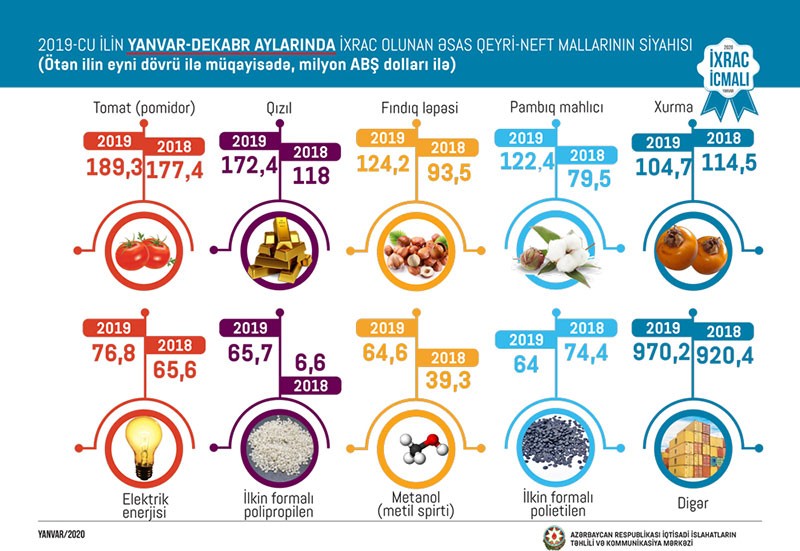 2019-cu ilin dekabr ayında qeyri-neft sektoru üzrə ixracda pomidor (22,6 milyon ABŞ dolları) birinci, xurma (20,1 milyon ABŞ dolları) ikinci, pambıq mahlıcı (14,9 milyon ABŞ dolları) üçüncü yerdə qərarlaşıb.