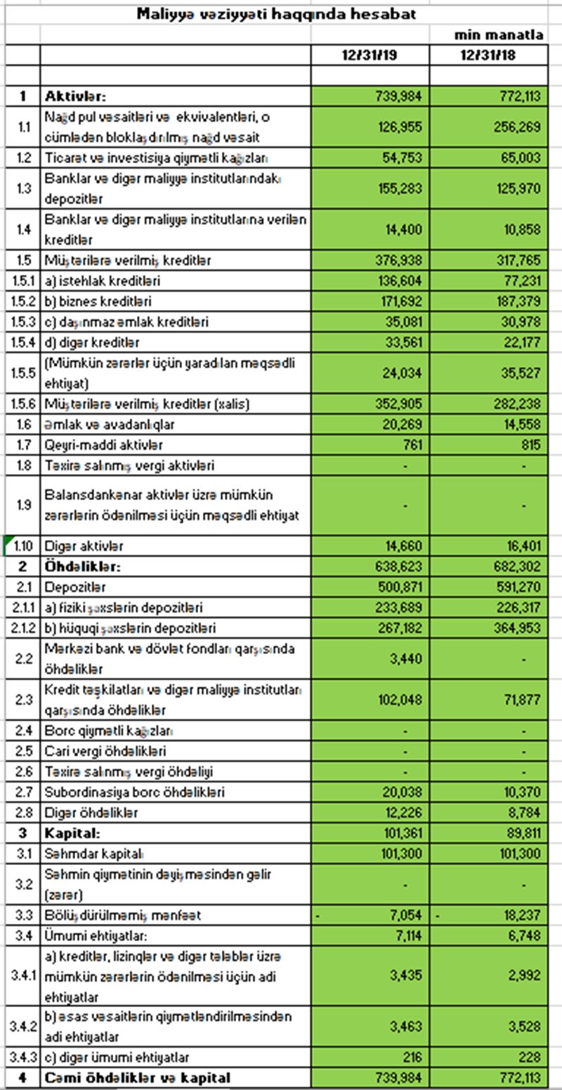 Müqayisə üçün qeyd edək ki, 2018-ci ildə “Rabitəbank”ın əməliyyat mənfəəti 8 milyon 697 min manat təşkil etmiş, əməliyyat mənfəətinin 5 milyon 574 min manatı mümkün zərərlər üçün yaradılan məqsədli ehtiyatlara ayrıldığından 3 milyon 124 min manat xalis mənfəət qalmışdı.