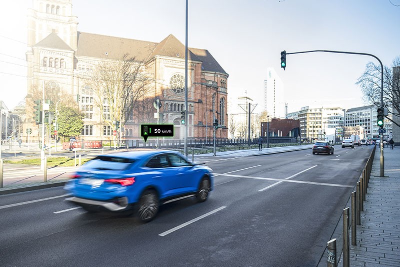 Hazırda bu xidmətə qoşulan svetaforların sayı artırılır. Svetaforlar haqqında informasiya yaşıl işıq üzrə sürəti optimallaşdırır və yaşıl işığın yanmasına qalan vaxtı təyin edir. Bu məlumatlar sayəsində sürücülər ehtiyac olmadığı halda sürəti artırmır. Beləliklə, yollarda stress yaşanmır və daha təhlükəsiz hərəkət baş verir. Sistem həm də svetafora 250 m qalmış sürətin tədricən azaldılmasını təklif edə bilər. Yaşıl işıq yandığı zaman Audi hərəkəti davam etdirir və yolda daha qənaətcil rejim əldə olunur. Əgər qırmızı işıqda dayanmaq qaçılmazdırsa yaşıl işığın yanmasına qalan vaxt saniyələrlə geri sayım formasında əks olunur. Bu halda sürücü ayağını qaz pedalından çəkə və yanacağa qənaət edə bilər.