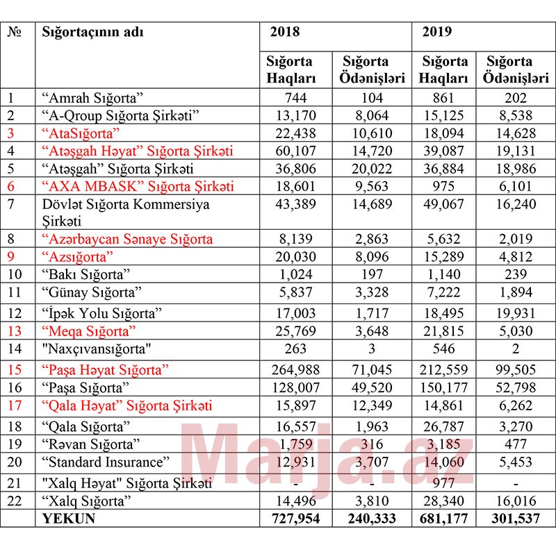 Belə ki, “AtaSığorta”, “Atəşgah Həyat”, “AXA MBASK”, “Azərbaycan Sənaye Sığorta”, “Azsığorta”, “Meqa Sığorta”, “Paşa Həyat Sığorta” və “Qala Həyat” şirkətləri ötən il 2018-ci illə müqayisədə daha az sığorta haqqı toplayıblar.