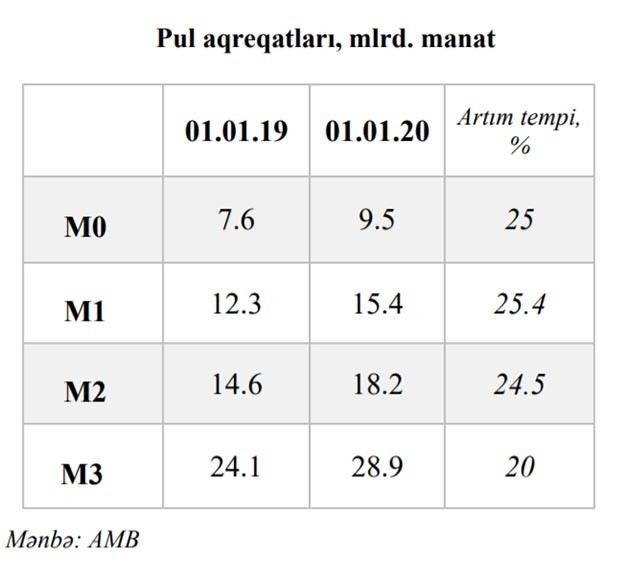 2019-cu ildə geniş pul kütləsi (M3) 20% artmış və dövrün sonuna 28.9 mlrd. manat təşkil etmişdir. M3 üzrə monetizasiya göstəricisi ötən illə müqayisədə 5 faiz bəndi yüksəlmişdir.