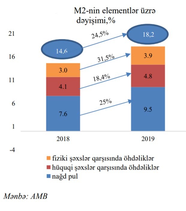 2019-cu ildə manatla geniş pul kütləsi (M2) 24.5% artmış və dövrün sonuna 18.2 mlrd. manat təşkil etmişdir. M2 üzrə monetizasiya göstəricisi (pul kütləsinin ÜDM-ə nisbəti) ötən illə müqayisədə 4 faiz bəndi yüksəlmişdir.