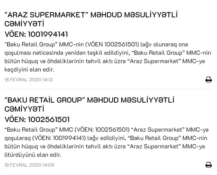 “Araz Supermarket” MMC də "Baku Retail Group” MMC-nin ləğv olunaraq ona qoşulması nəticəsində yenidən təşkil edildiyini, “Baku Retail Group” MMC-nin bütün hüquq və öhdəliklərinin təhvil aktı üzrə “Araz Supermarket” MMC-yə keçdiyini elan edib.