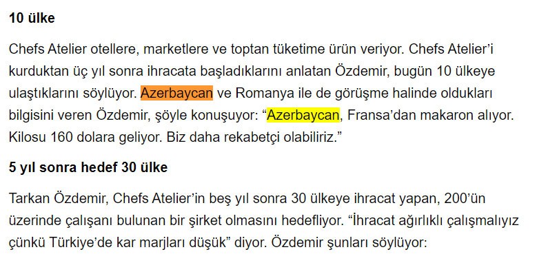 Azərbaycan və Rumıniya ilə danışıqlar apardıqları məlumatını verən Özdəmir bildirib: "Azərbaycan Fransadan makaron alır. Kilosu 160 dollara gəlir. Biz daha rəqabətçi ola bilərik".